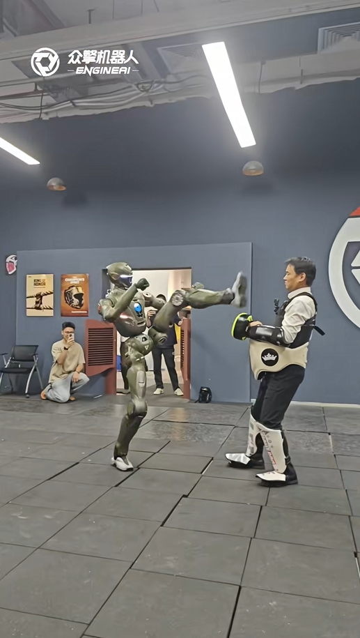 视频中,众擎CEO赵同阳身穿护具,第一次成功躲过T800的飞脚,但险些被正面踹中,差点用脸接招。