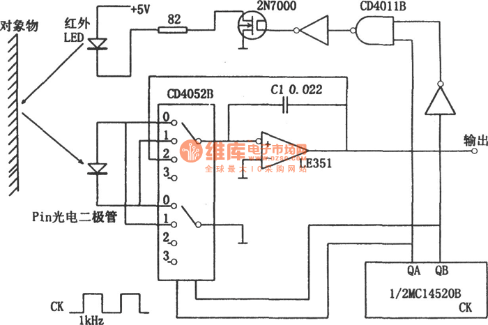 如图所示为反射光强度的检测电路。该电路由红外发...