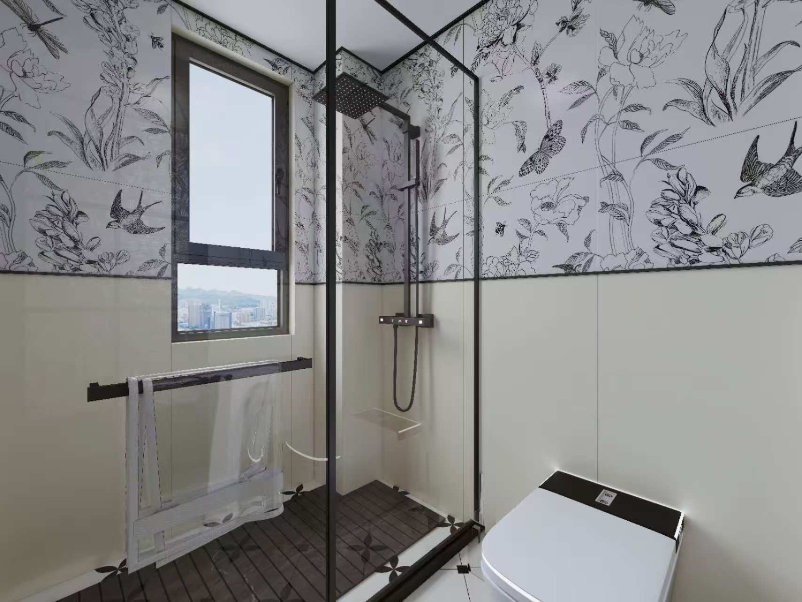 设计个性复古,黑白花卉纹理瓷砖铺贴别具特色。黑色淋浴装置与智能马桶提升使用体验,玻璃淋浴房实现干湿分离,整体空间利用高效,细节处彰显法式复古的设计理念。