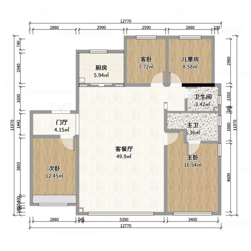 客餐厅面积达49.9㎡,空间开阔大气;包含主卧(16.54㎡)、次卧(12.45㎡)、客卧(7.72㎡)、儿童房(8.58㎡),满足家庭多元居住需求;配备厨房(5.94㎡)、主卫(5.36㎡)、卫生间(3.42㎡),还有4.15㎡的门厅,功能分区合理且空间质感突出。