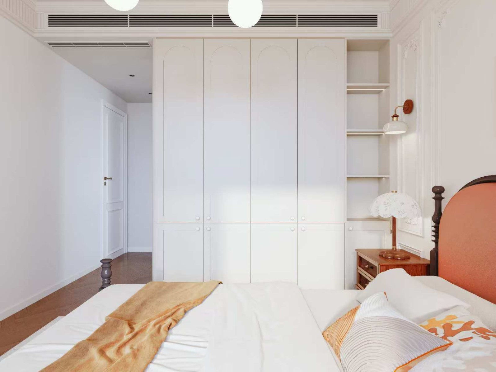 设计雅致温馨,白色基调搭配复古元素的床具与软装,尽显法式风情。床头复古台灯与精致的床头柜,提升空间品质感,整体营造出浪漫且富有格调的休憩环境。